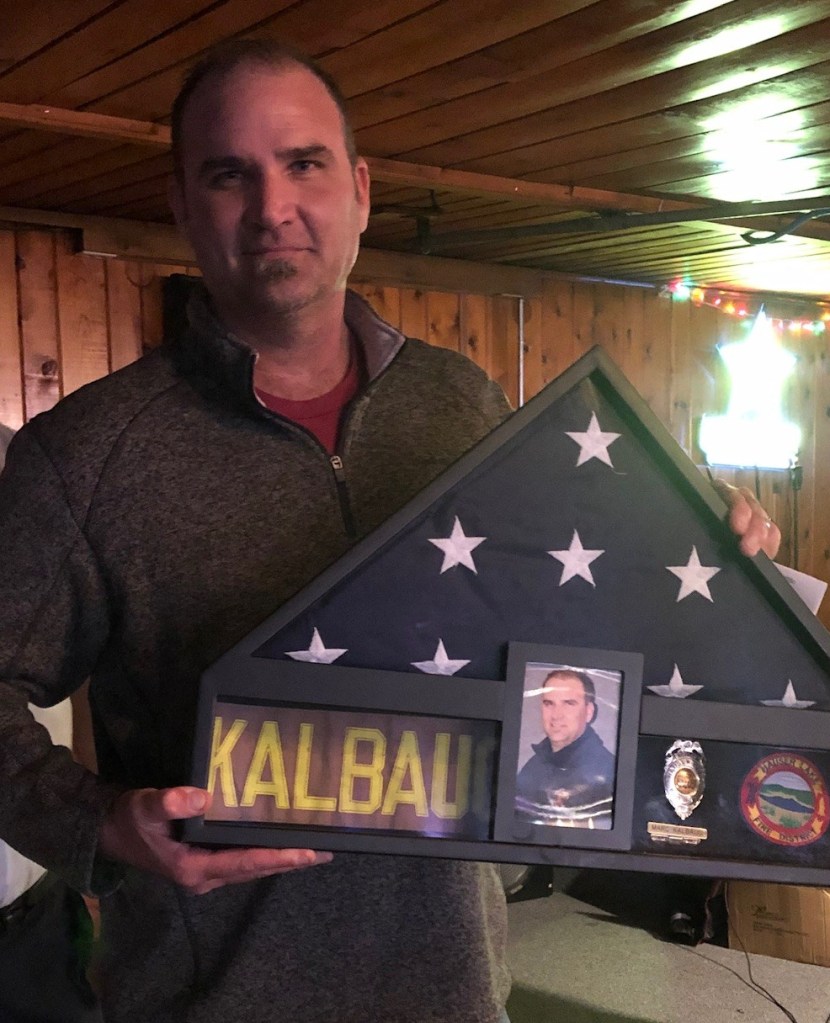Marc Kalbaugh holds the shadowbox given to him as a gift from the HLFPD upon retirement.